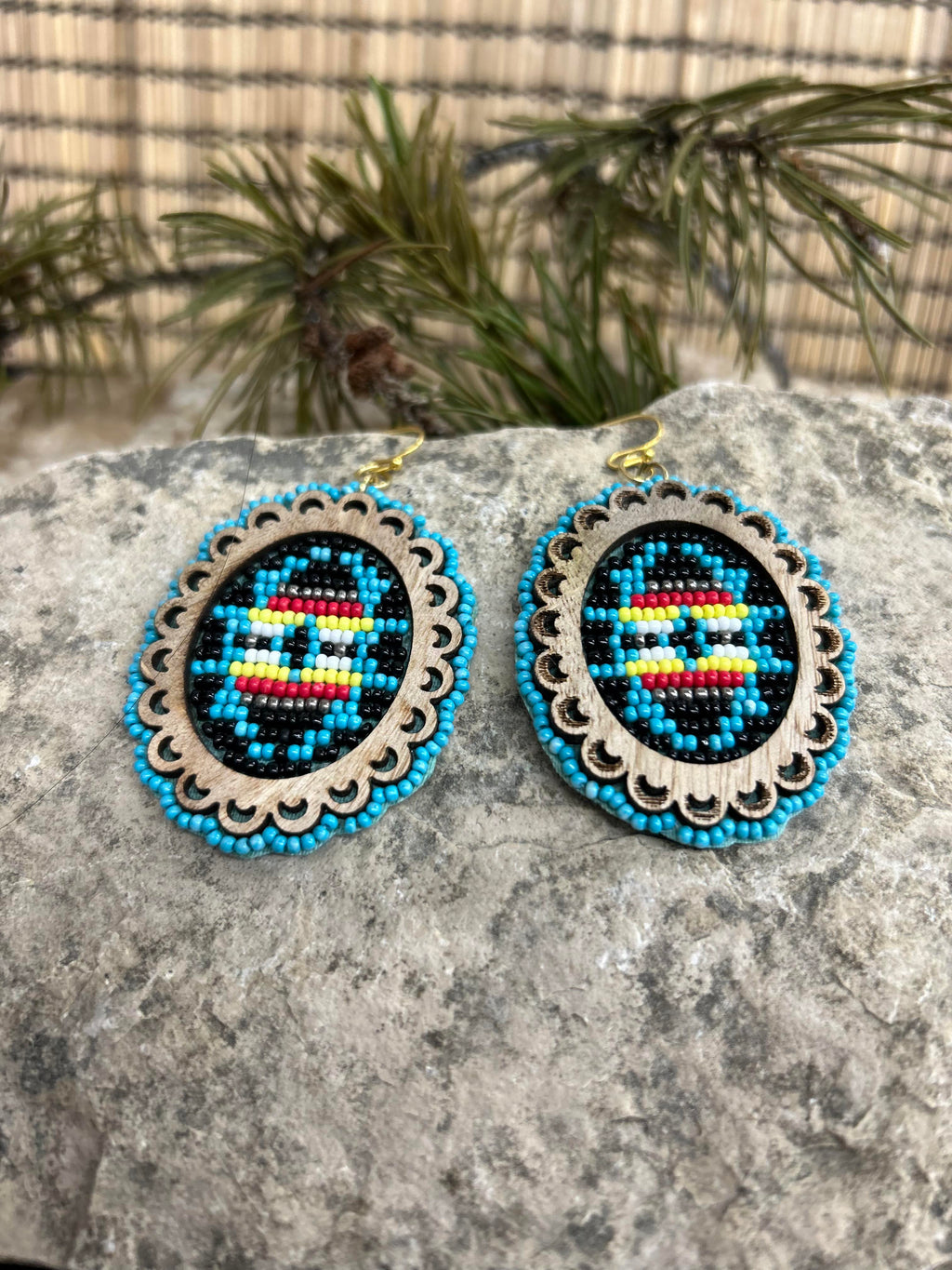 Wooden Oval Turquoise Beaded Earrins